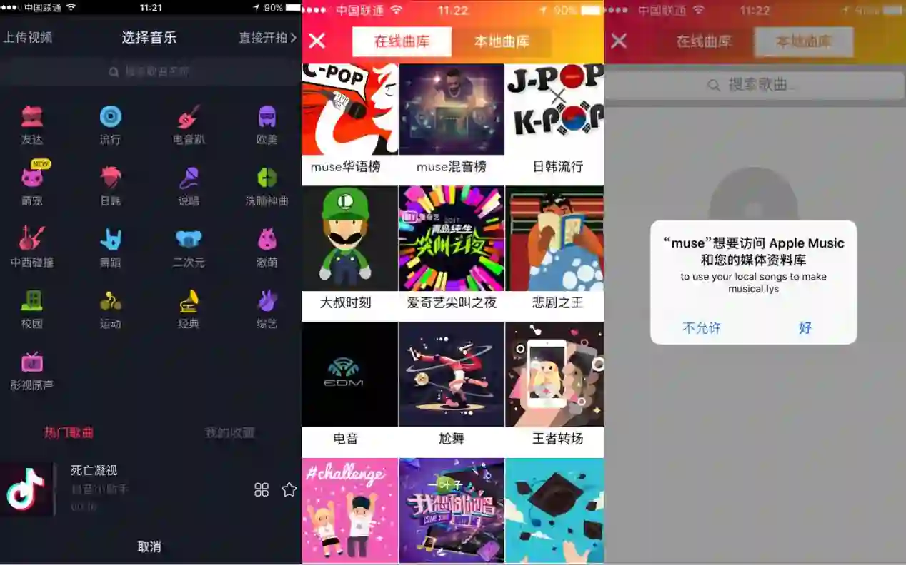 左为抖音界面,中和右为muse界面