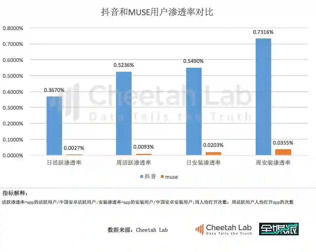 尽管在海外取得了瞩目的成绩,musical.ly的“回归”之路却十分坎坷。以下是猎豹全球智库(Cheetah Lab)基于安卓用户的渗透率数据,对中国版musical.ly,也就是muse,和抖音的对比。