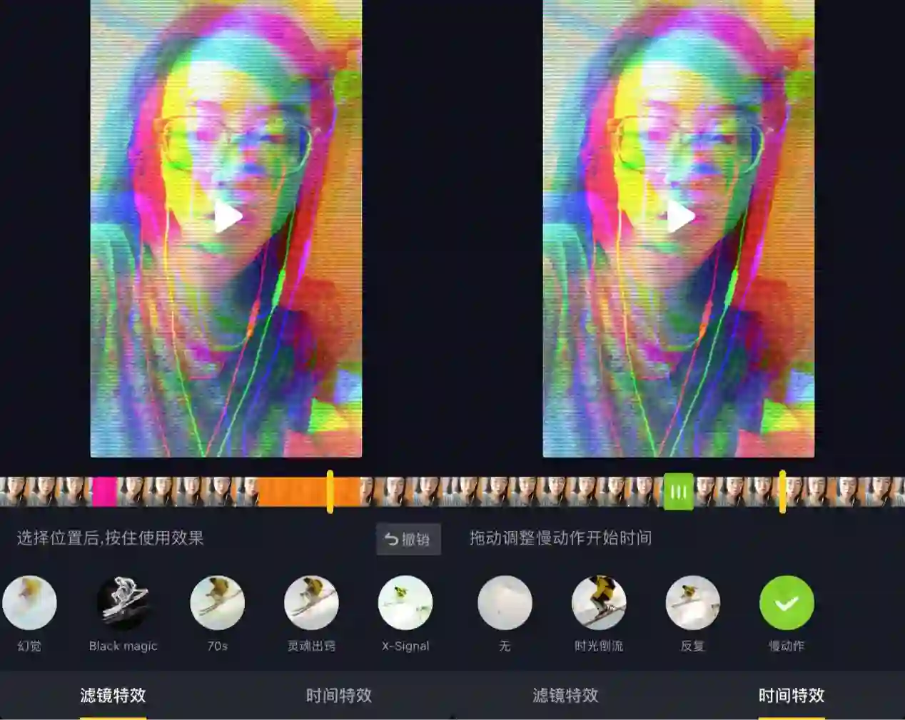 在特效方面,基本上分为滤镜和动作两类,前者与其他视频APP相似,后者则是音乐短视频的重点。用户通过运用慢动作、反复、抖动等效果,使视频产生强烈的律动感,很多创意呈现也是通过动作特效的运用产生的。