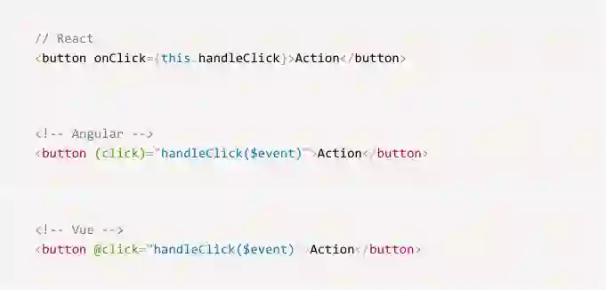 这三个框架都可以在组件中指定事件处理器,从而实现对 DOM 事件的监听,并在它们被触发时执行某些 JavaScript 代码。