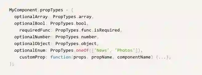 子组件必须明确声明它希望接收的 props 或 inputs,我们也可以给这些数据指定类型。在 React 中可以使用 PropsType 函数库(https://www.npmjs.com/package/prop-types)来指定类型,例如: