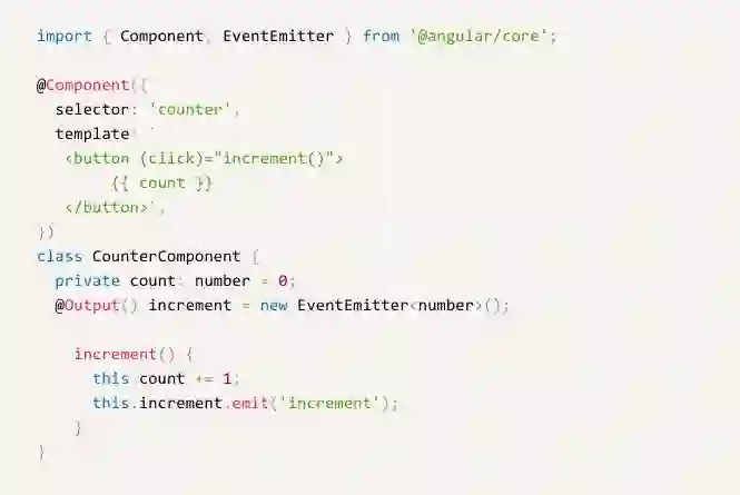 在 Angular 中自定义事件可以通过使用 @Output 修饰符给 EventEmitter 实例添加注解来实现,并通过调用 event emitter 的 emit 方法来触发这个自定义事件: