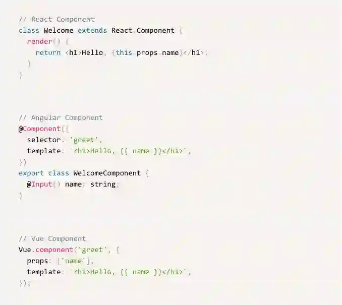 当然三个框架的代码也存在差异,例如,在 React 中我们可以用函数来实现组件。Angular 和 Vue 可以引用定义在 HTML 文件中的模板。Vue 还可以在一个独立的 `.vue` 文件中编写集 HTML,CSS 和 JS 于一体的组件。然而,组件的核心思想在所有三个框架中都是相同的。