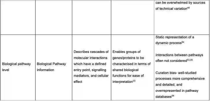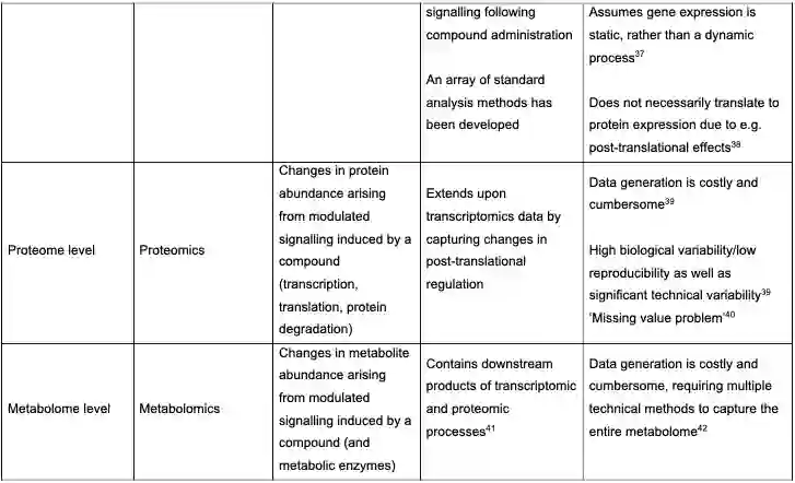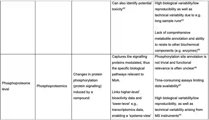 分析的生物学层次包括Direct drug-target、Gene level、Proteome level、Metabolome level、Phosphoproteome level、Phenotype level、Biological pathway level,如下表。论文对这些点都进行了具体讨论,包括机器学习在这一块的应用。