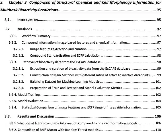 第三章:“通过比较结构化学和细胞形态信息,使用多任务学习对生物活性预测“。利用细胞涂饰分析中的细胞形态信息(以CellProfiler特征的形式)和化学结构信息(以Extend connectivity Fingerprints的形式)进行比较。比较表明,有一些靶点可以通过细胞形态学信息可以更好地预测,如b-catenin,还有一些靶点可以通过化学结构信息更好地预测,如属于G-蛋白偶联受体1家族的蛋白质。