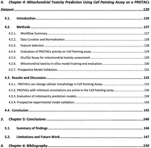 第四章:“在PROTACs数据集上使用细胞绘制分析预测线粒体毒性”,探讨了使用细胞绘制分析成功分析新数据模式(PROTACs)的方法,并评估了该分析方法是否可用于理解这些新化合物的安全性。在PROTACs数据集中,细胞形态特征(以CellProfiler特征的形式)成功预测了线粒体毒性。这项工作产生了第一个使用基于细胞绘制的特征预测PROTACs线粒体毒性的ML模型,并扩展了我们对PROTACs安全性预测的知识。