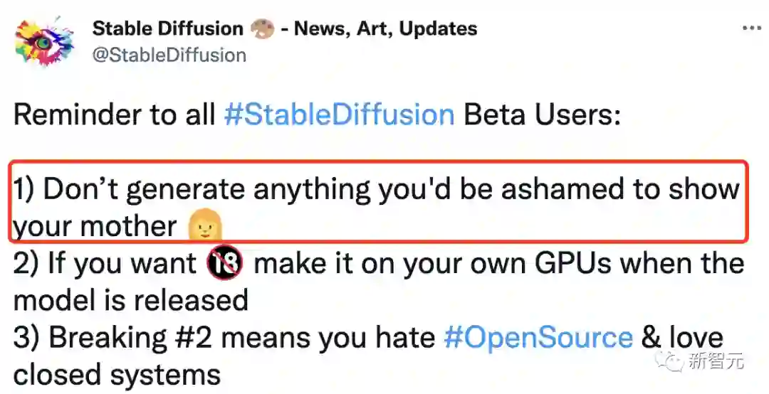 Stable Diffusion便在社交媒体推特中提醒道,「不要生成任何羞于向你妈妈展示的内容。」