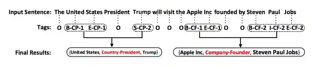 图 1 是一个如何将原始标注数据(实体+实体关系)转换为论文中提到的新型标注方式的示例。在数据中,每一个词汇会被赋予一个实体标签,因此通过抽取和实体有关的词语,构成实体。