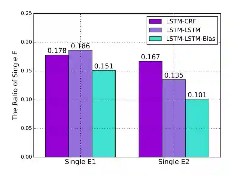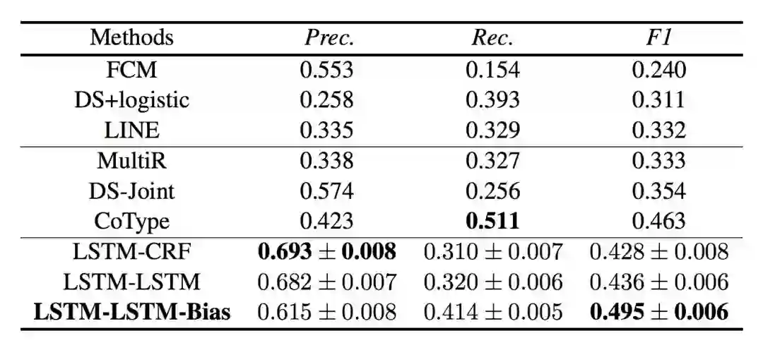 在不同深度学习的表现对比中,作者发现,LSTM-LSTM 方法好于 LSTM-CRF。论文认为,这可能是因为 LSTM 较 CRF 更好地捕捉了文本中实体的较长依赖关系。