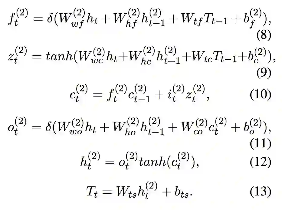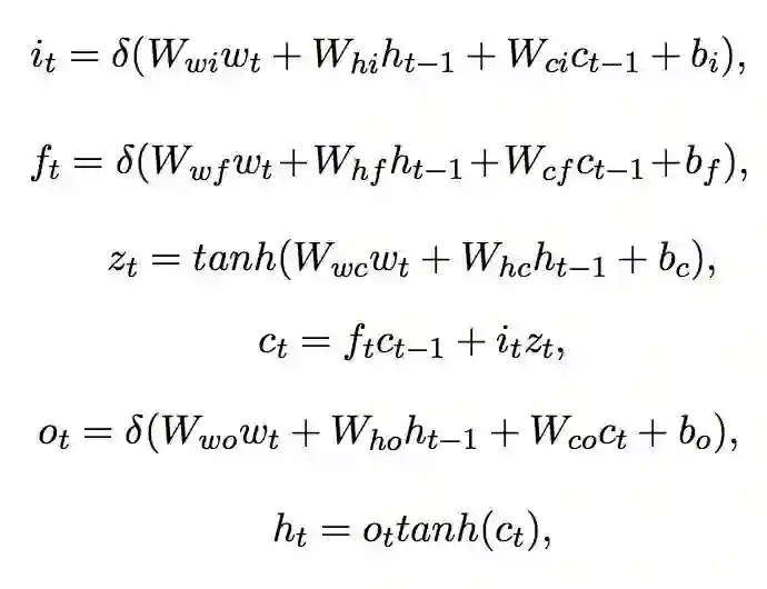 公式 1 中的 i,f 和 o 分别为 LSTM 模块在 t 时刻的输入门,遗忘门和输出门。c 为 LSTM 模块的输出,W 为权重。对于当前时刻,其隐层向量的结果取决于起义时刻的