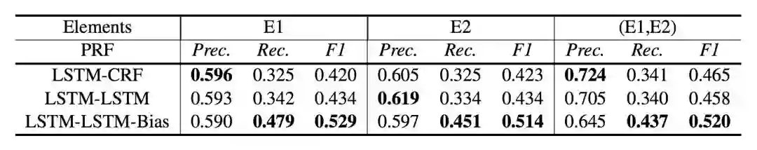 表 1 也说明深度学习方法对三元组结果的抽取基本上好于传统方法。作者认为,这是因为深度学习方法在信息抽取中普遍使用双向长短时编码器,可以较好地编码语义信息。