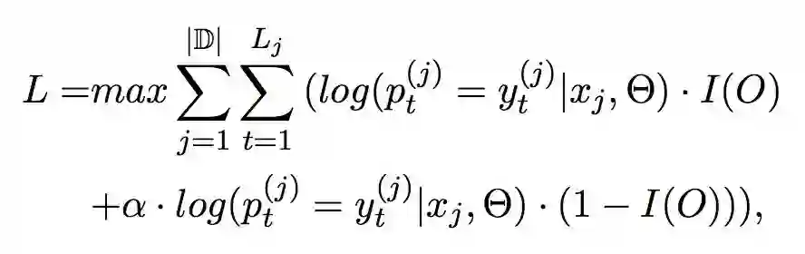 是归一化的 tag 的概率。I(O) 是一个条件函数(switching function),用于区分 tag 为“O”和不为“O”的时候的损失。