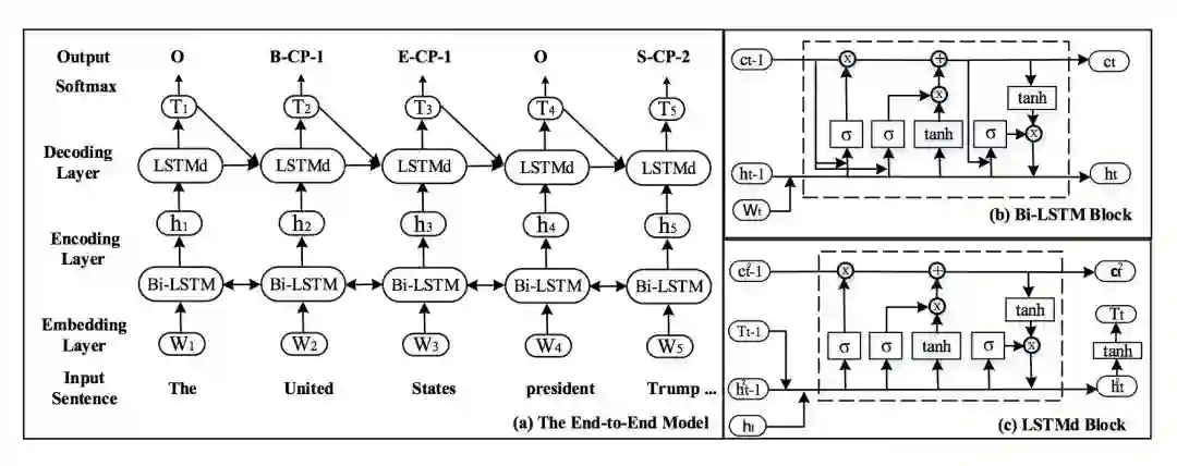 在序列标注问题中,双向长短时编码器体现了对单个词语的语义信息的良好捕捉。这一编码器有一个前向和后向的长短时层,并在末尾将两层合并。词嵌入层则将词语的独热编码(1-hot representation)转换为词嵌入的向量。