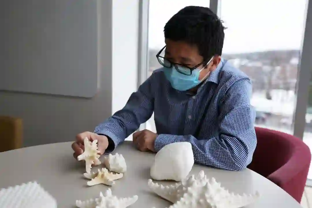 图 | Li 博士展示海星骨架和 3D 打印模型(来源:Alex Parrish for Virginia Tech)