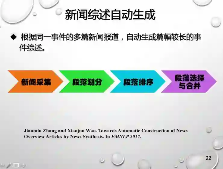 我们也做了新闻综述的自动生成的尝试。我们对于某一个事件已经有比较多的新闻报道,需要思考怎样基于这些报道去自动生成一个篇幅较长的事件的综述。我们所使用的对象是用Wikinews,它的内容基本都是比较客观、比较中立的综述。它会对已有的报道做一些分析,做一些无偏袒的综合,然后得到一篇长的综述。我们拿这样的数据做了一个实验,去做一些语句的筛选和组合。因为要构成一个综述,所以不是以句子为单位,而是以一个子话题为单位。我们首先划分子话题,每个话题对应一个段落。然后对它进行一个重要性的排序,最后做一个段落的选择,也就是子话题的选择并且把相关的子话题合并,得到一个更完备的子话题最终形成完整的事件的综述。