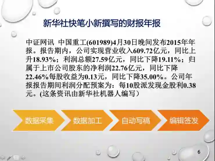 最后是一个未来的展望。我们看到现在机器写稿不光是在媒体行业,我们现在也在跟一些游戏行业和情报行业合作,他们也有机器写稿的需求,只要什么时候你需要写这样一些报告,比如写一些行业报告,或者写一些稿件,都可能会利用到机器写稿的技术,不光是媒体行业写新闻会用到,其它的行业也会用到。