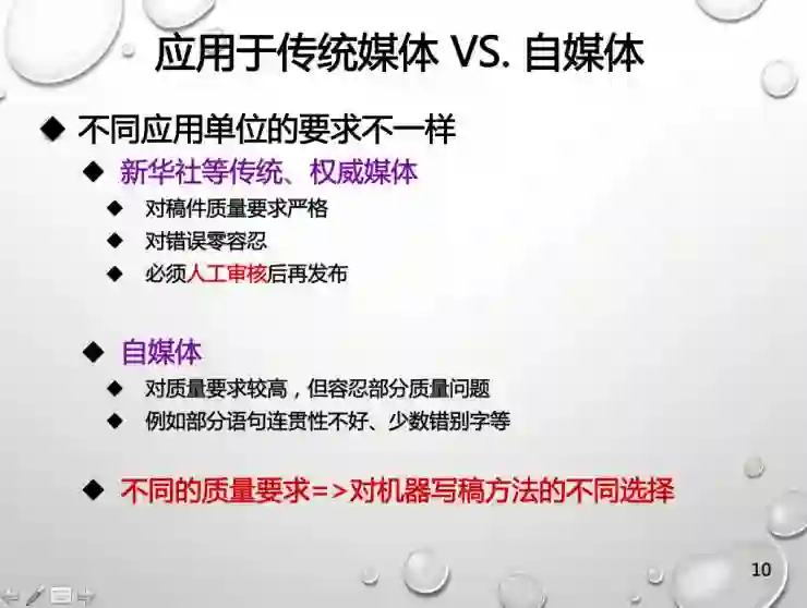 对于不同的应用单位,对稿件的质量要求是不一样的,对于一些传统的媒体单位,它对稿件的错误是零容忍。要发布到报纸上需要通过人工的审核,而一些自媒体可能就直接发在网上,个别的错别字或者个别的语句不通顺不影响网友的阅读,网友可能在下面写一个评论,说这个稿件怎么还有错别字,但是这个也不影响网友的阅读和点击。所以自媒体对稿件的质量容忍度比较高一点。所在两种不同的场合下应用的要求是不太一样的,所以我们在机器写稿发稿的时候也会有所不同。