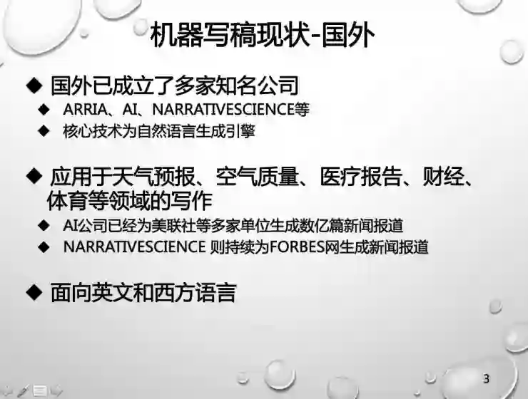 早在几年前,国外就已经有机器人写稿,最具代表性的是来自美国、欧洲的三家公司:ARRIA、AI、NARRATIVE SCIENCE。据说他们的机器人采用英语或者西方语言为著名的媒体网站写了数千万篇稿件。