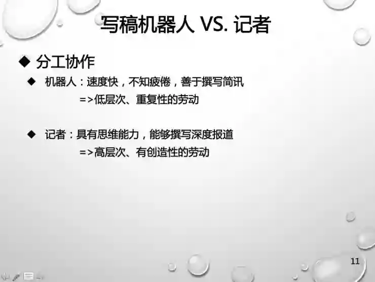 另外一个不同点就是,记者在写一个稿件的时候,他是很清楚地知道我在写什么,他知道自己要表达的语义。但实际上机器人在写这个稿件的时候,虽然他把每一个句子都写出来了,但实际上他不知道自己要写什么,这是最大的一个不同,就是说它没有理解自己的稿件,虽然它写出来了,包括机器人写诗,或者写各种歌词的时候,它也把那个语言写出来了,但是它并没有真正理解那个语言,所以这是一个比较大的不同。