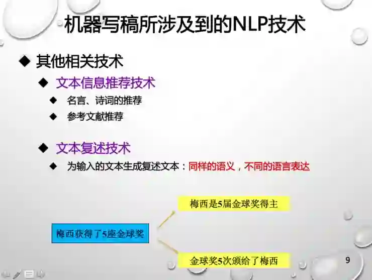 还有其它的一些相关技术:文本信息推荐技术和文本复述技术。比如说我们在写一个稿件的时候,有时候会想引用一句名人的话或者引用一个唐诗宋词,机器会自动给你推荐。第二个是文本复述技术,我们基于一个个稿件做创作的时候,如果我们直接把原文原始的内容拷贝过来,这个有点抄袭的嫌疑。所以这时候我们就需要做一些复述,会用不同的语言去表达同样的语义。这里有一个例子是说“梅西获得了5座金球奖”,你可以改为“梅西是五届金球奖得主”,也可以改写为“金球奖5次颁给了梅西”,这样就可以避免版权的问题,也可以让我们的改写更加生动。