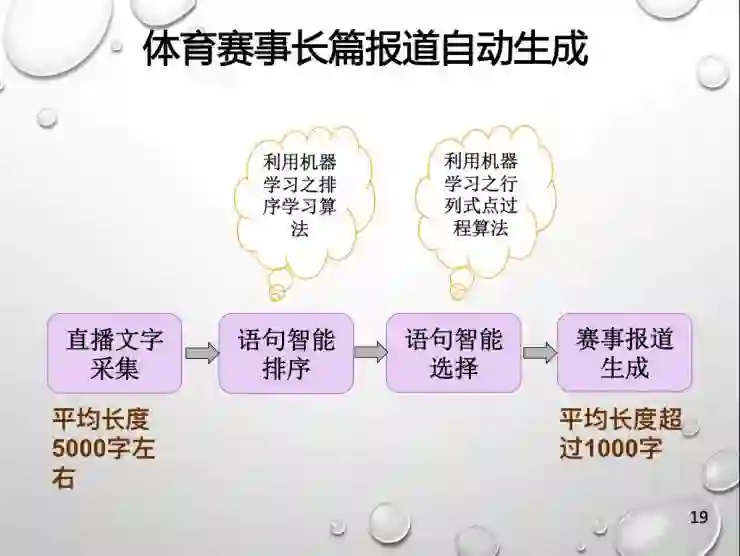 另一个是体育赛事的长篇报道的自动生成。简讯包含的信息量很少,我们想生成一个长篇的报道来介绍整个比赛的过程。我们经常发现著名的体育比赛下面都有文字直播,通常包含主持人对这样一个比赛的精彩细节的描述,我们通过机器学习的手段,能够把这些精彩的描述挑选出来,放到我们最终的报道中,这个报道就写得比较长,可以达到上千字以上。首先借助机器学习的手段,对直播文字进行语句的智能排序,再进行智能选择,最后生成一个平均长度超过1000字的赛事的报道。我们看到直播文字一般会达到数千字,一般是5000字以上,所以要从5000字中选择和拼凑出1000字以上的长篇报道。
