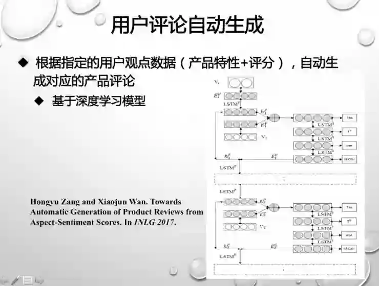 除了生成事实型的新闻之外,我们也尝试让机器人去生成用户的评论。我们输入对于产品的某一个特征或者某几个特征上的评分,比如我输入给这个软件的是我对这个汽车的操控性是5分评价,对它的外观是3分评价,根据这个评价会自动生成一个自然语言的评论。我们采用的是一个深度学习的模型,右边是这样一个模型的架构。我们提前可以看我们最终生成的这样一个例子。