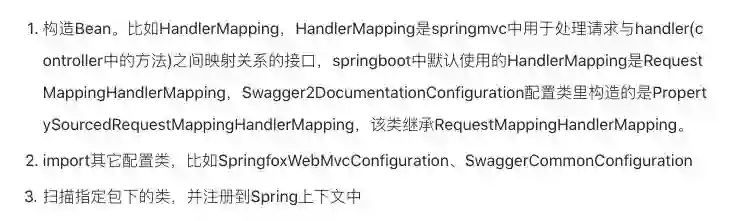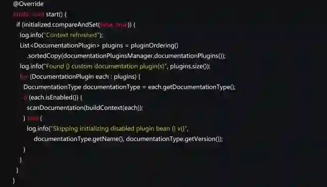DocumentationPluginsBootstrapper启动类也会在之前提供的配置类中被扫描出来。它实现了SmartLifecycle接口,在start方法中,会获取之前初始化的所有documentationPlugins(也就是Spring上下文中的所有Docket)。遍历这些Docket并进行scan扫描(使用RequestMappingHandlerMapping的getHandlerMethods方法获取url与方法的所有映射关系,然后进行一系列API解析操作),扫描出来的结果封装成Documentation并添加到DocumentationCache中: