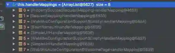 多了一个HandlerMapping,并且优先级高。以下是springboot应用DispatcherServlet的HandlerMapping集合。其中springfox构造的PropertySourcedRequestMappingHandlerMapping优先级最高。优先级最高说明第一次查询映射关系都是走