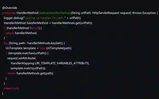 PropertySourcedRequestMappingHandlerMapping复写了lookupHandlerMethod方法,首先会去handlerMethods属性中查询是否存在对应的映射关系,没找到的话使用下一个HandlerMapping进行处理: