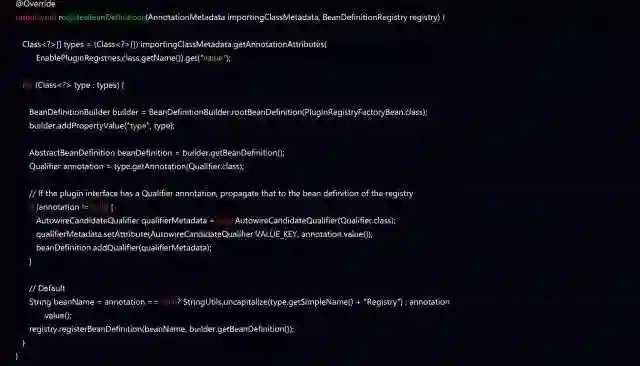@EnablePluginRegistries注解内部使用PluginRegistriesBeanDefinitionRegistrar注册器去获取注解的value属性(类型为Plugin接口的Class数组);然后遍历这个Plugin数组,针对每个Plugin在Spring上下文中注册PluginRegistryFactoryBean,并设置相应的name和属性。