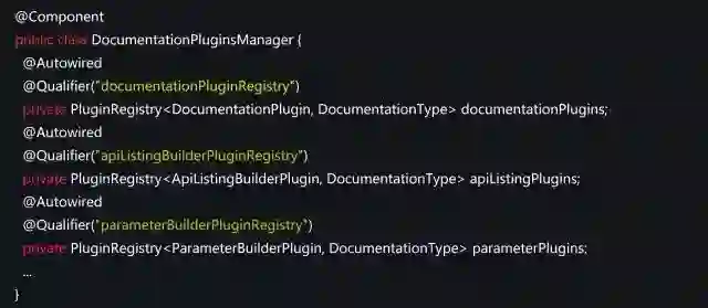 DocumentationPluginsManager类会在之前提到过的配置类中被扫描出来,它内部的各个pluginRegistry属性都是