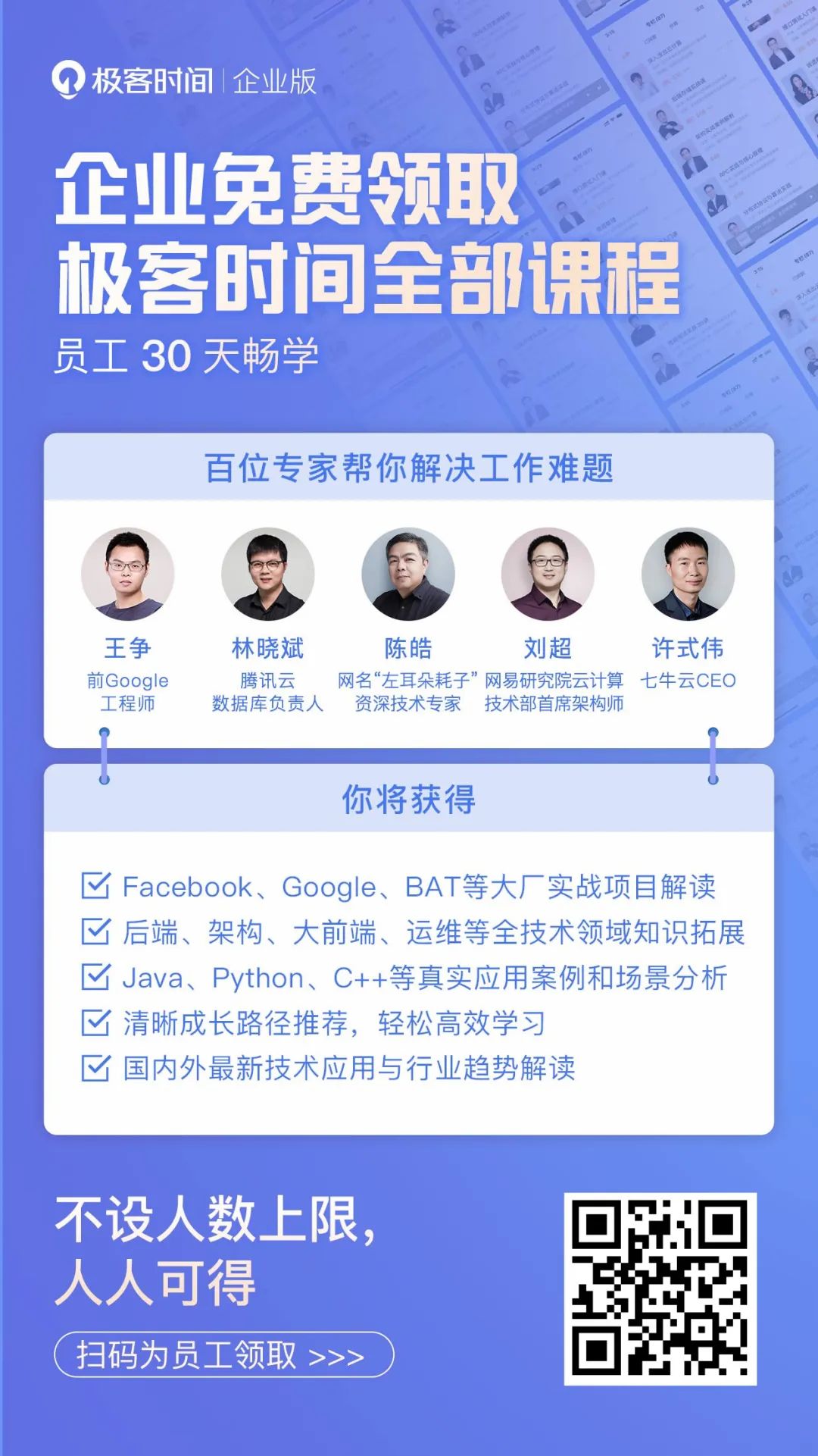 通过和这些受访企业培训负责人的交流,我们相信企业在线学习是大势所趋,极客时间企业版也是顺势而为。希望在这个特殊时期,能够服务更多的企业和团队,帮助他们打造卓越研发团队。