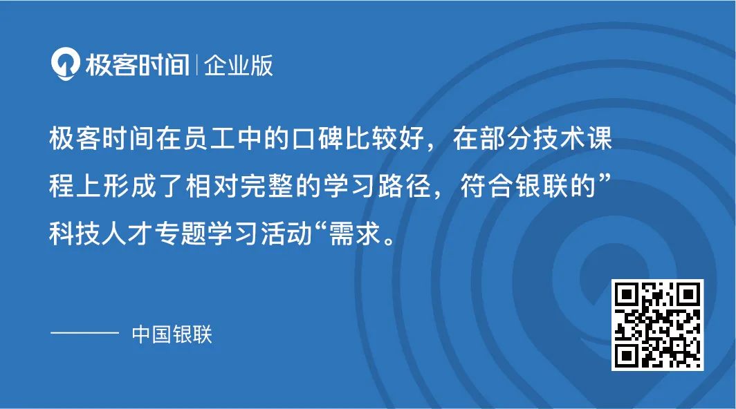 中国银联从 2012 年开始就引入了线上培训的方式。在技术人才培训方面,由于极客时间在员工中的口碑比较好,在部分技术课程上形成了相对完整的学习路径,符合银联的”科技人才专题学习活动“需求。今年初,银联尝试引入了极客时间企业版为内部员工提供体系化的在线学习。