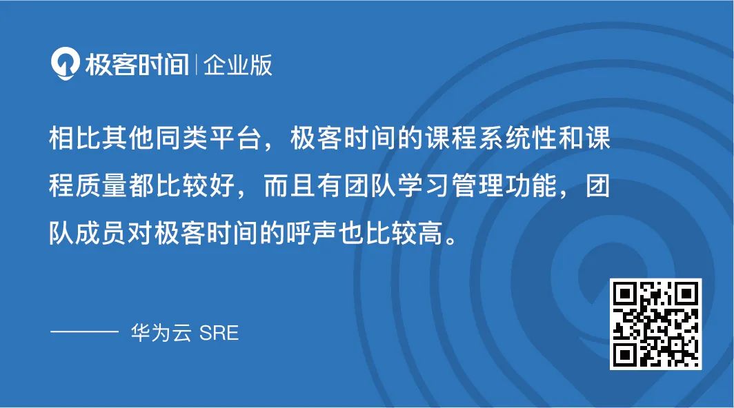 “相比其他同类平台,极客时间的课程系统性和课程质量都比较好,而且有团队学习管理功能,团队成员对极客时间的呼声也比较高。”华为云 SRE 架构师王海宇评价。