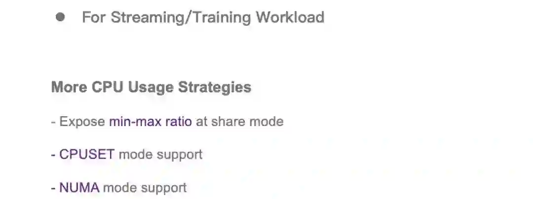 除了开启 YANR 原生默认支持的 CGroup 限制之外,我们还配置了更加丰富的 CGroup 管理策略,比如在 share 模式下支持自定义的最大值限制,支持绑核,支持绑 NUMA 节点等. 通过这些措施,给流式作业和训练作业更加灵活的管控策略,满足不同场景下的隔离或共享需求。
