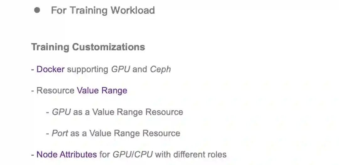 为了更灵活的资源申请,定制了带范围的资源值:传统的 YARN 资源只有个数, 没有范围,比如多少个 CPU,多少 GB 内存,但在训练场景下,有时希望有范围,比如当需要两个 GPU 卡时,不止希望随意的两张卡,而是希望要一台机器上两个连号的 GPU 卡,比如卡 0 和卡 1 是连号的,而卡 0 和卡 2 不是连号的。这个场景同样也适用于端口号。