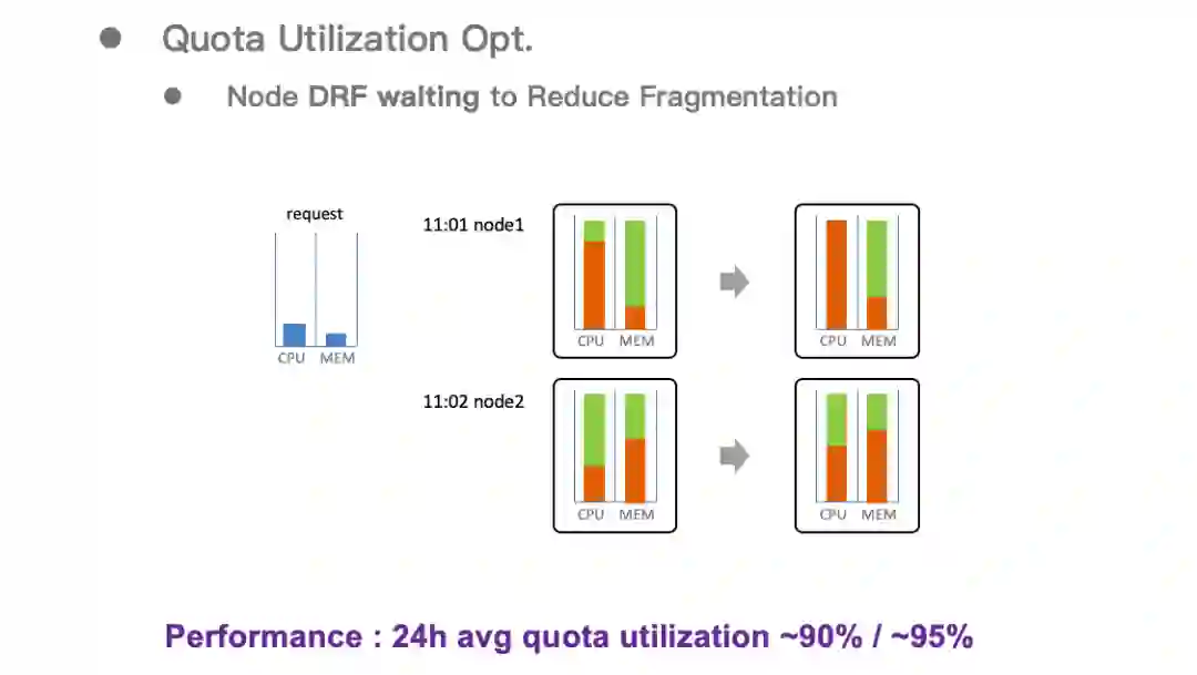 通过引入这个机制,集群资源的碎片化问题大幅降低,生产环境中可以达到 CPU 和内存的 24 小时平均利用率都在 90%以上。