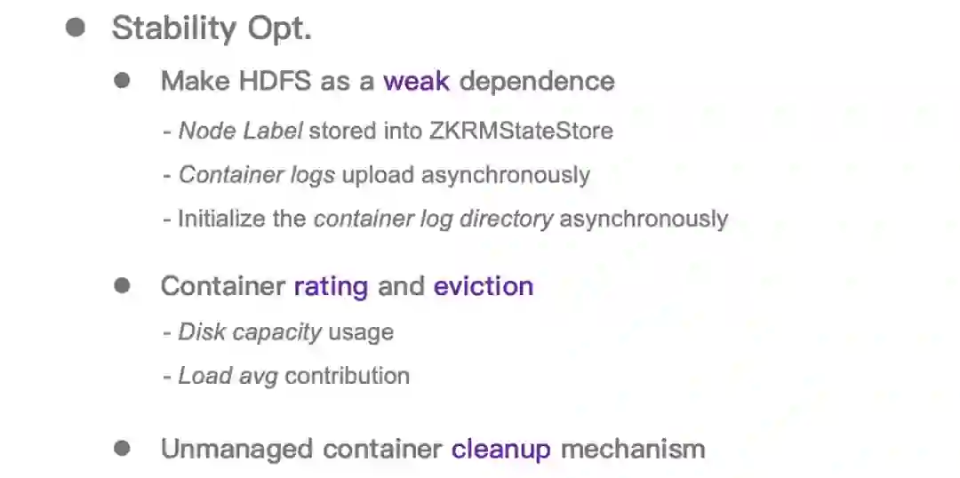 稳定性提升:包括摆脱对 HDFS 强依赖, Container 分级与驱逐, 非受控 Container 管理。