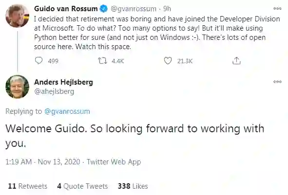 Van Rosum发推后,微软在回应中并没有透露他的项目安排。但从字数有限的推特内容中,我们可以得知:Van Rossum加入了微软的开发者部门。他表示能做的事情很多("Too many options to say”),而且可以肯定的一点是:他将与微软团队一起,使Python更好使用,且不局限于Windows系统。Van Rossum的一位粉丝在推特下回复,设想将Python用在硬件上,并得到了Van Rossum本人的回应!加入微软后,Van Rossum将给我们带来怎样的惊喜呢?让我们拭目以待。 参考链接:https://techcrunch.com/2020/11/12/python-creator-guido-van-rossum-joins-microsoft/https://blog.dropbox.com/topics/company/thank-you--guido
