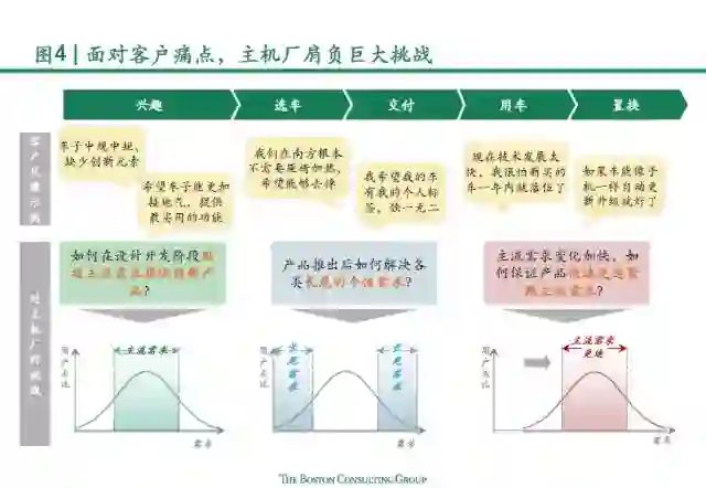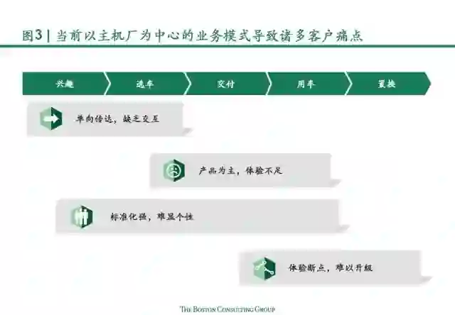 近期,BCG与国内某主机厂联合举行了一次围绕中国汽车消费者全生命周期的体验调研,结合以往的行业经验和消费者洞察,我们发现中国的汽车用户从兴趣、选车、交付、用车到置换过程中面临的痛点可以归结为四大类: