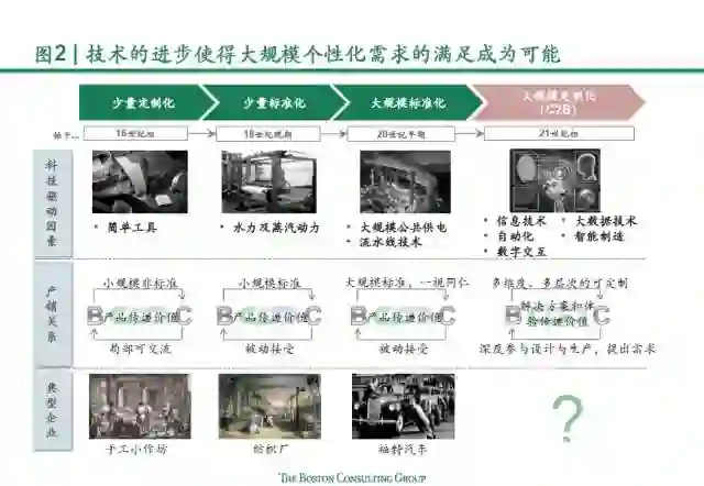 从整体消费品市场的维度来看,定制化需求在“消费新生代”中表现尤为明显,他们对于品牌和产品有更加深刻、独到的认识以及更加理性的态度,希望通过消费品来彰显个性,而非简单的满足功能性。因此,建立满足个性化需求的能力,成为厂商抓住新生代消费者的关键。在技术层面,大数据、智能制造等技术使得制造业的大规模定制化成为可能。工业生产技术进步重要的转折点在福特推出流水线生产时出现,此后制造业一致向标准化、规模化和精益化发展。直到21世纪初,技术的进步使得大规模个性化需求的满足成为可能。基于信息化、自动化、数字交互、大数据和智能制造技术,定制化的边界也不断延伸,从模块化、菜单化的狭义可定制逐渐向多维度、多层次的全面可定制扩展。消费者因而能够深度与厂商或平台进行交互,提出个性化需求。