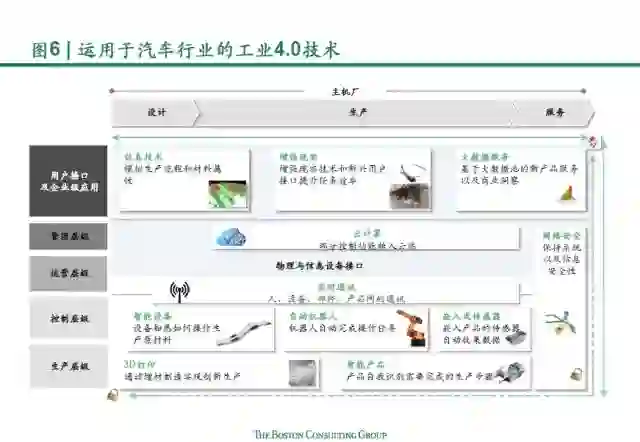 我们认为仿真、增强现实、大数据、云计算、实时通讯、网络安全、智能设备、自动机器人、嵌入式传感器、3D打印、智能产品是在汽车领域拥有广阔应用前景的技术。其运用场景覆盖从生产现场到用户接口的所有层级,帮助主机厂完成从设计、生产到服务的全面能力提升。在生产端,主机厂通过对这11项核心技术的应用可显著提升生产柔性、效率、质量和速度。
