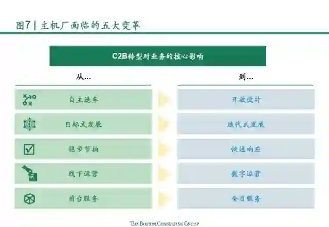 需要澄清是,对于主机厂而言打造C2B能力不等同于布局新兴科技。受限于科技发展现状,很多硬性能力无法一步到位,主机厂应该抱着迭代和渐进的态度,先从理念和软实力上入手,将企业逐步转变成符合C2B商业逻辑的形态,等到技术成熟时自然能够水到渠成。针对企业需要面临的变革,我们总结了五大方向。