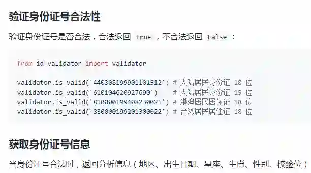 可以用来验证身份证号合法性、获取身份证号信息、生成可通过校验的假数据、身份证升级。