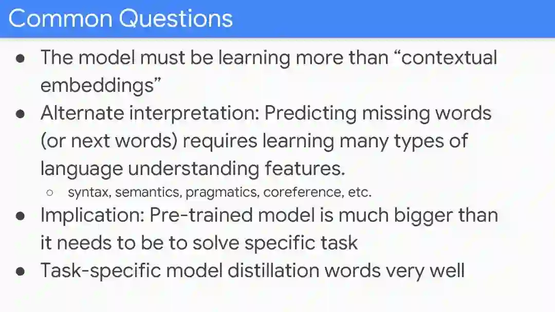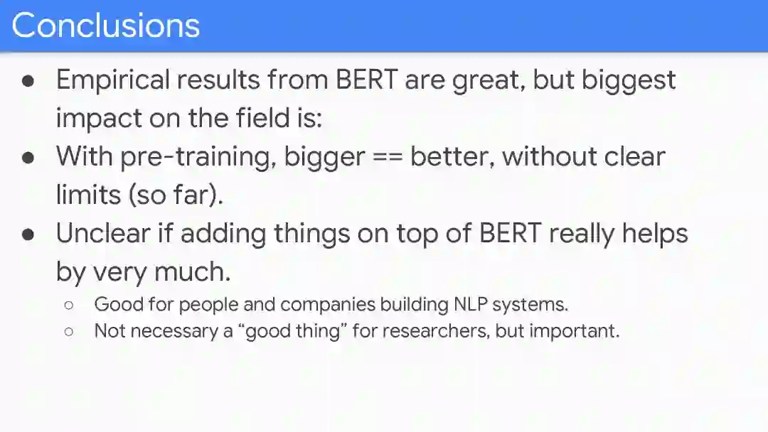 【导读】前不久,斯坦福NLP组,邀请BERT模型的第一作者Jacob Devlin到斯坦福做讲座,Devlin在讲座上详细介绍了BERT的研究过程,并解答了大量关于BERT的问题,小编收集到该PPT, 分享给大家。