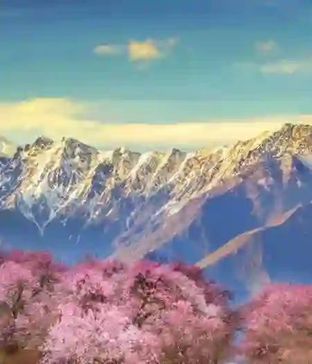 我深信不疑,好像生怕错过了什么似的,等待着与林芝相见。直至某个初春的清晨,隔着初生的太阳,那淡粉色的花瓣努力从卷缩中舒展开来,等到天空稍稍明亮一点,呼啦啦地,满树密密麻麻,漫山密密匝匝,远远望去好似一张绿色地毯上春光乍泄。