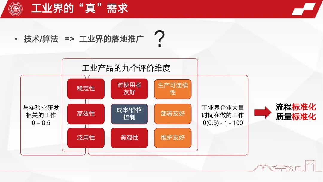 工业界在意什么呢?客户能够感知到红色的这五部分;后面的橙色的部分,其实是我们厂方能感知到的东西,最后结合红色橙色这八个东西,还要去控制成本。
