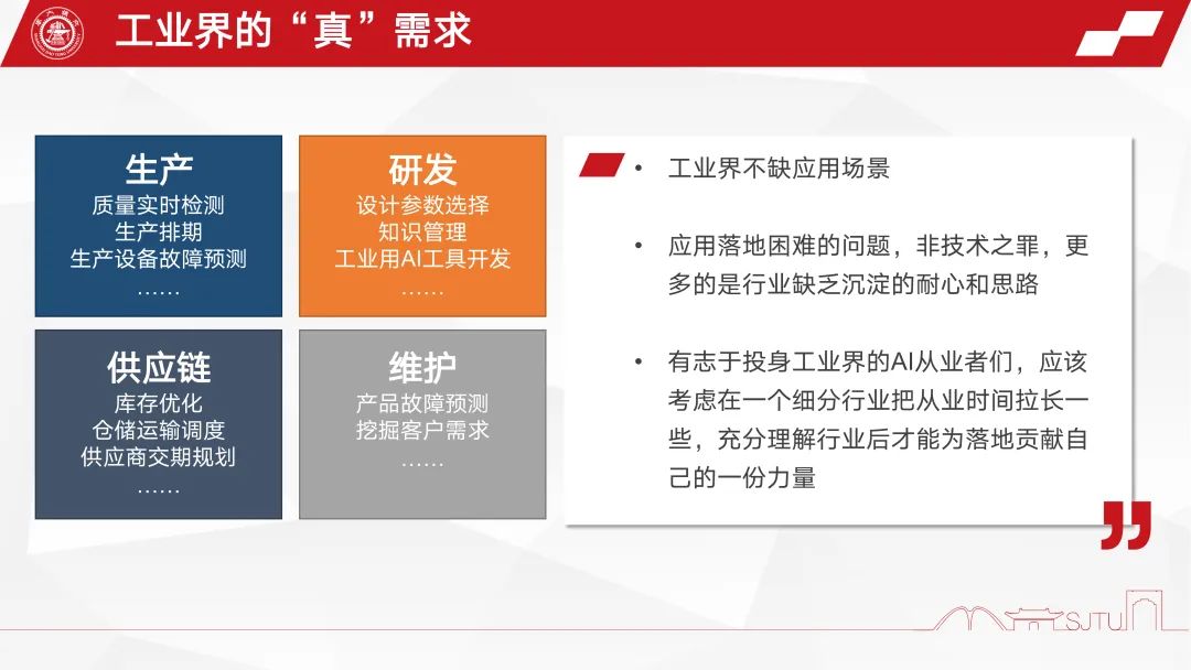 在我看来的话,其实工业场景有非常多可以用到 AI 的地方。当然工业场景的数据获得会比互联网代价高很多。因为互联网可能你一次点击,就能获得一批高质量的数据。但在工业现场,你可能得装一批传感器,而且要防止设备造成扰动,还要做数据清洗,这些工作都会抬高数据获得成本。但是在获得数据,有很多工作可以做。