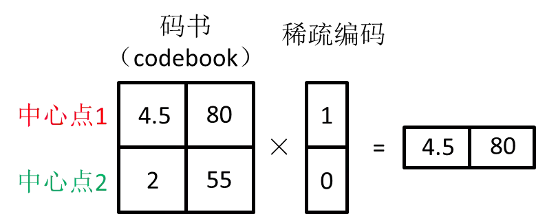 矢量量化是一种数据压缩技术,目前主要在语音、图像和视频的压缩中被广泛使用。矢量量化的核心思想很简单,将相似数据进行聚类,同一类中的数据点用一个代表值来替换,并将所有的数据用一个矢量表示。举一个简单的例子,如图2所示,数据分布在一个二维平面中,根据矢量量化的原理,1)先将数据进行聚类;2)找到数据聚类的中心点:(4.5, 80)和(2, 55),并生成码书(code book);3)将所有数据按照码书,生成对应的稀疏编码。这种编码的优点是能够对原始数据产生非常高的数据压缩比(在图2的例子中,所有二维平面上的数据只用了2个数据点即可表示),且简单易行。我们所熟悉的jpeg,mpeg-4等媒体的压缩格式中,都有利用矢量量化进行数据编码的过程。在矢量量化中,稀疏编码表示的是数据所属的分类信息。矢量量化的技术难点在于定义码书的过程,从最早通过解多维积分问题到后来通过数据训练(LBG-VQ,SDL,K-SVD)获得,其技术已逐步成熟并市场化。