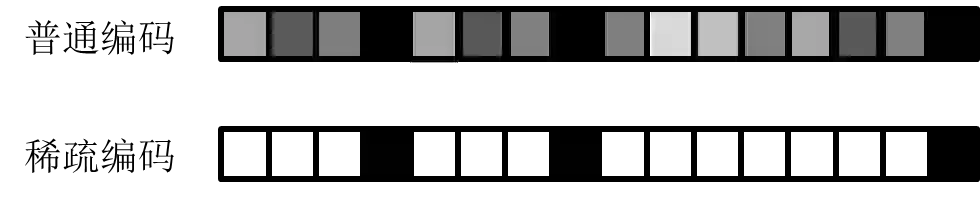 稀疏编码从字面上可以理解为具有稀疏结构的一种编码方式。相比于一般的编码结构,稀疏编码通常只需要使用到编码中的少数几个维度即能刻画对应的事物(见图1)。直观上讲,这种编码方式便于存储和访问,因此也便于检索。有一种游戏,不少人都玩过,有一人心中默想一样事物,周围的人通过不断的提问,去猜出刚才他心里想的。例如,“能吃么?”—是(答);“是水果么?”—是;“一般是红色的么?”—是;“要削皮么?”—是;“北方的产地主要在山东么?”—是。相信此刻“苹果”这个答案大家一定猜的八九不离十了吧。和玩这种游戏一样,不仅要猜出出迷人心里所想的,更要用采用最少的回合数(问题)来完成。采用稀疏编码和玩这种游戏有类似的地方,需要利用最少的有效编码位,准确地区分和刻画事物。那么,如何来获得稀疏编码呢?